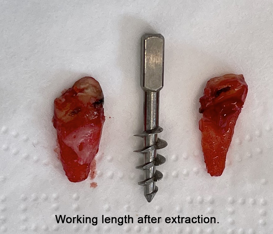 - Photo of the length of the drill with the root and an implant as a reference to establish the implant dimensions.