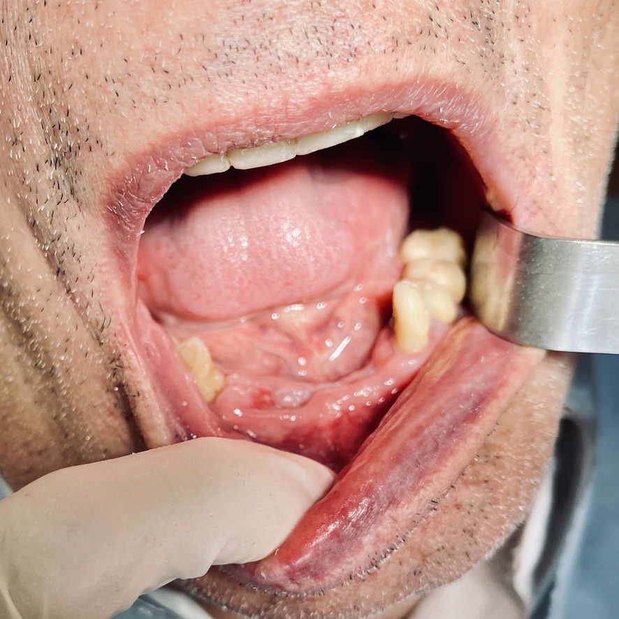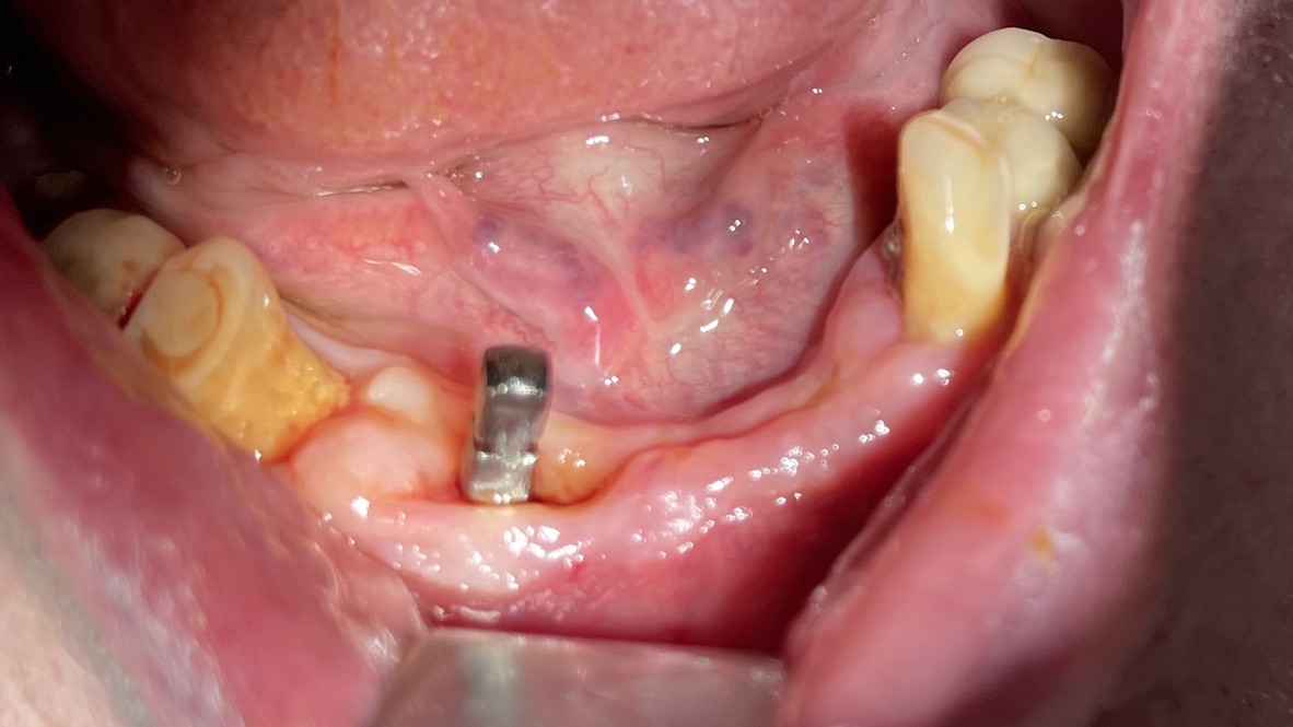 Thus the perforation of the lingual cortices can induce the laceration of vessels of the buccal floor with extravasations which, even if not important, are still clearly visible and annoying.