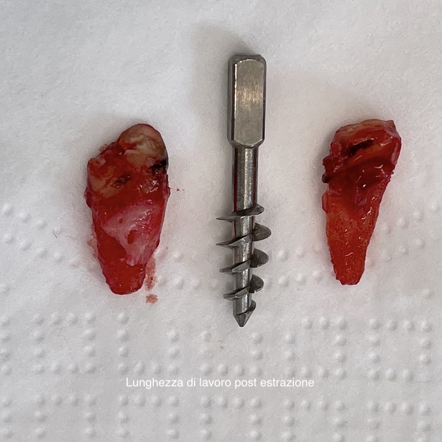 - Foto della lunghezza della fresa con la radice ed un impianto come riferimento per stabilire le dimensioni implantari.