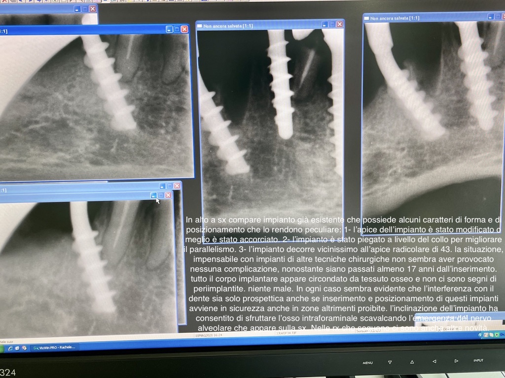 - Aperta la TAC a video con le sezioni in cui si lavora. Rivalutazione di altezza, spessore, inclinazione, densità, particolari strutturali, spessore ed andamento delle corticali, andamento del canale mandibolare nella mandibola, sue dimensioni ed eventuali sdoppiamenti, andamento del pavimento del seno mascellare, del pavimento nasale, struttura del tuber ove necessario per il mascellare.