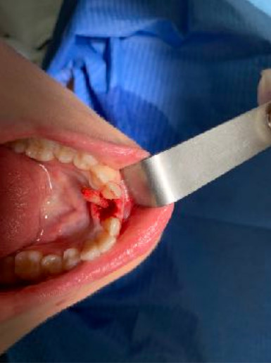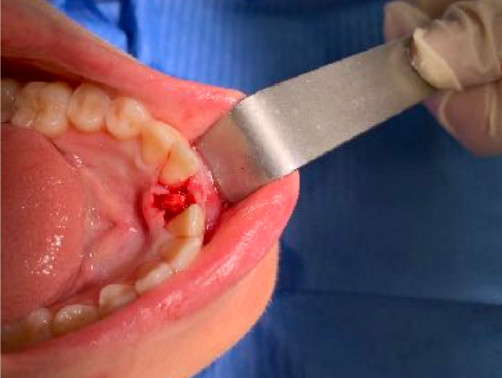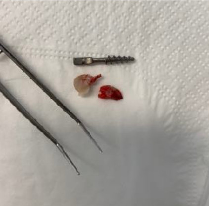 Il diametro ridotto del collo consente di mettersi al riparo da eventuali periimplantiti e migliora nettamente la velocità della guarigione. In questo caso è stato maschiato con un diametro 4 ed è stato inserito un impianto di Tramonte diametro 4 mm a 7 spire a collo corto . Il titanio utilizzato è sempre di grado 4.
